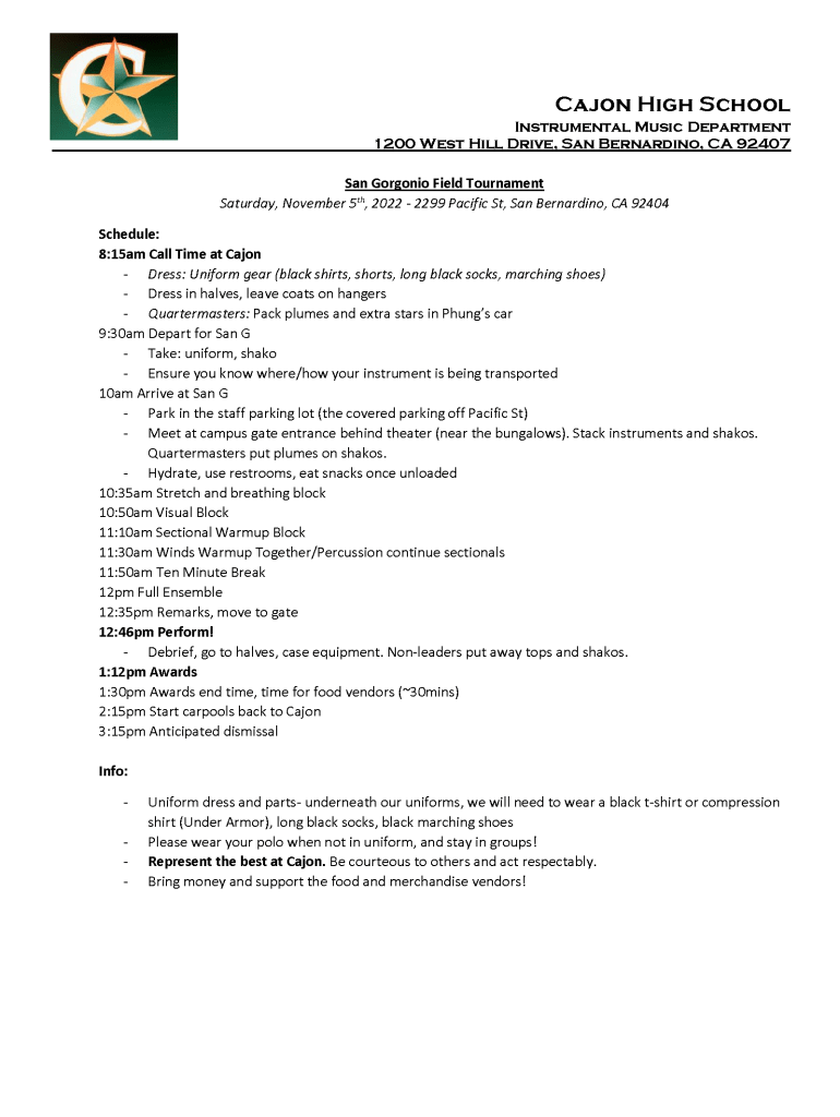 San Gorgonio Field Tournament November 5th Carpools: The next marching band competition is on Saturday, November 5th at San Gorgonio High School. Since the competition is across town, and especially since this year we don’t have a lot of equipment with our marching band production, we will be carpooling to the competition. Times will be provided with an itinerary once they are posted. If you can provide a ride for other students, please fill out this form: